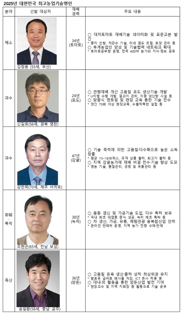 ¿ÃÇØ ¡®´ëÇѹα¹ ÃÖ°í³ó¾÷±â¼ú¸íÀΡ¯À¸·Î ¼±Á¤µÈ 5ÀÎÀº ´ÙÀ½°ú °°´Ù.
