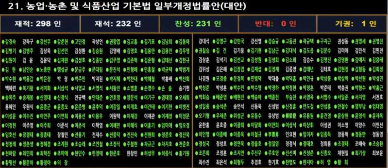 * ¡®³ó¾÷¡¤³óÃÌ ¹× ½Äǰ»ê¾÷±âº»¹ý(³ó¾÷½Äǰ±âº»¹ý) °³Á¤¾È¡¯ÀÌ Àç¼® ÀÇ¿ø 232ÀÎ Áß 231ÀÎ Âù¼ºÀ¸·Î ±¹È¸ º»È¸ÀǸ¦ Åë°úÇß´Ù.