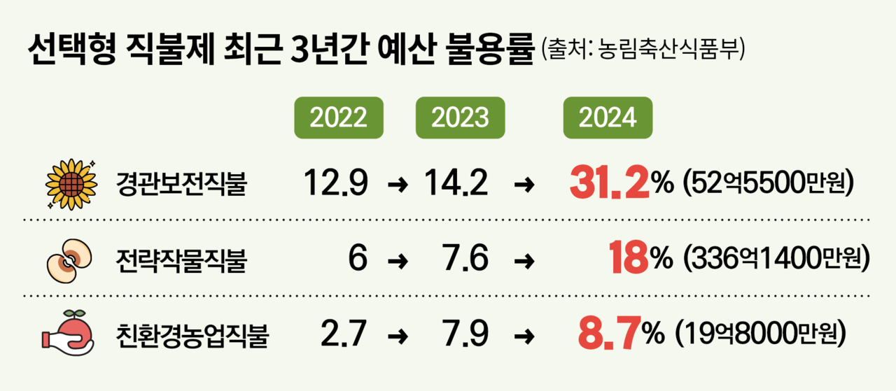 ºÒ¿ë¾× Áõ°¡ ¿øÀο¡ ´ëÇØ ³ó½ÄǰºÎ´Â »ó´ëÀûÀ¸·Î ³·Àº Á÷ºÒ±Ý ´Ü°¡, Á¶°ÇÀ» ÃæÁ·ÇÏÁö ¸øÇÑ ³ó°¡ ¼ö Áõ°¡ µîÀ» ²Å¾Ò´Ù. °æ°üº¸ÀüÁ÷ºÒÀÇ °æ¿ì »ó´ëÀûÀ¸·Î Àμ¾Æ¼ºê°¡ ³ôÀº Àü·«ÀÛ¹°Á÷ºÒ·ÎÀÇ À̵¿ÀÌ ÀϾ°í, ÀÌ»ó±âÈÄ ¿µÇâÀ¸·Î Àç¹è±âÁØ ÃæÁ·ÀÌ ¾î·Á¿öÁö¸é¼ Çù¾àÀ» ÀÌÇàÇÏÁö ¸øÇÑ ³ó°¡°¡ Áõ°¡ÇÑ °ÍÀ» ¿øÀÎÀ¸·Î Áö¸ñÇß´Ù. ģȯ°æ³ó¾÷Á÷ºÒÀº Áö¼ÓÀûÀΠģȯ°æ Àç¹è¸éÀû °¨¼Ò, ¹«³ó¾àÁ÷ºÒ±Ý Áö±Þ Ƚ¼ö ÃÖ´ë 3ȸ Á¦ÇÑ µîÀ» ºÒ¿ë Áõ°¡ ¿äÀÎÀ¸·Î ¹àÇû´Ù. Àü·«ÀÛ¹°Á÷ºÒÀÇ °æ¿ì 2023³âºÎÅÍ µµÀԵŠºÒ¿ë¾× ÃßÀ̸¦ ÆÇ´ÜÇÒ µ¥ÀÌÅͰ¡ ºÎÁ·ÇÏ´Ù¸ç °ü·Ã ´äº¯À» À¯º¸Çß´Ù.