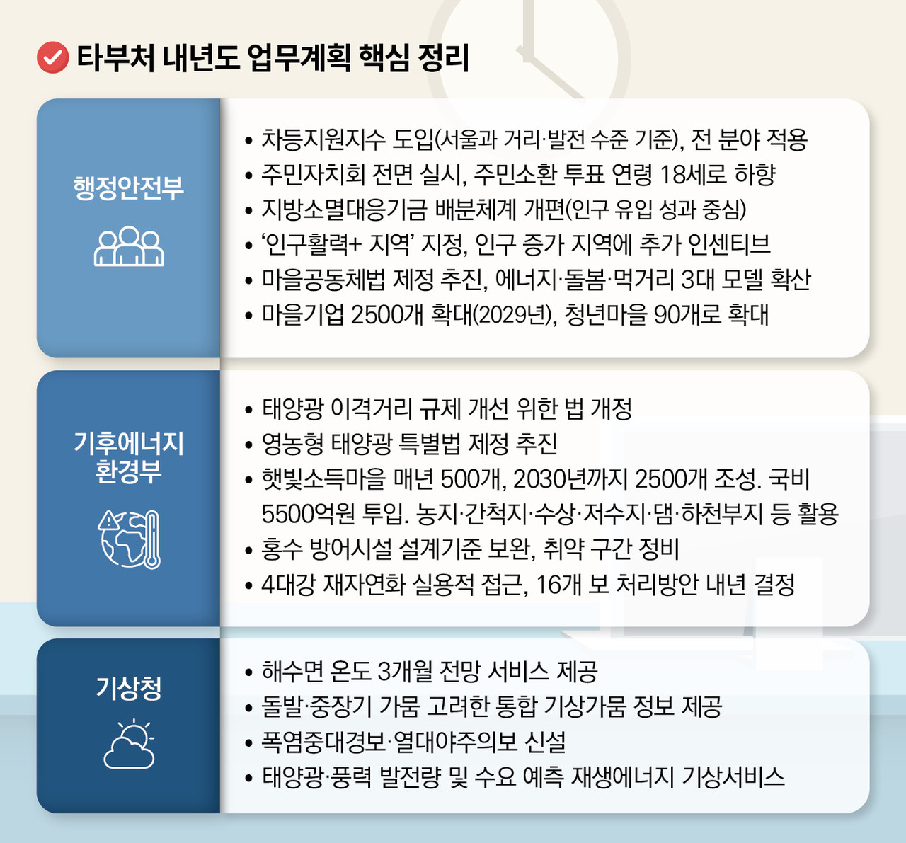 Á¤ºÎ°¡ ³»³â ±¹°¡±ÕÇü ¹ßÀü°ú Áö¹æÀÚÄ¡ ºÐ±Ç, ±âÈÄÀ§±â ´ëÀÀÀ» ÇÙ½É °úÁ¦·Î »ï°í ±¹Á¤ ¿î¿µ¿¡ ¼Óµµ¸¦ ³½´Ù. Â÷µîÁö¿øÁö¼ö µµÀÔ°ú ¡®Àα¸È°·Â+Áö¿ª¡¯ ÁöÁ¤ µî Áö¹æ ¿ì´ë Á¤Ã¥À» º»°ÝÈÇϰí, ÅëÇÕÆ¯º°½Ã Ãâ¹ü°ú ÁÖ¹ÎÀÚġȸ Àü¸é ½Ç½Ãµµ Áö¿øÇÑ´Ù. ¿µ³óÇü ž籤°ú ÇÞºû¼Òµæ¸¶À» Á¶¼º µî Àç»ý¿¡³ÊÁö È®´ë¿Í È«¼ö¡¤°¡¹³ ´ëÀÀÀ» À§ÇÑ ±âÈÄ ÀÎÇÁ¶ó ÀçÁ¤ºñ¿¡µµ Àû±Ø ³ª¼±´Ù. ÀÌ °°Àº ³»¿ëÀº 17ÀÏ ÇàÁ¤¾ÈÀüºÎ¿Í ±âÈÄ¿¡³ÊÁöȯ°æºÎ¡¤±â»óûÀÇ ´ëÅë·É ¾÷¹«º¸°í¿¡ ´ã°å´Ù.