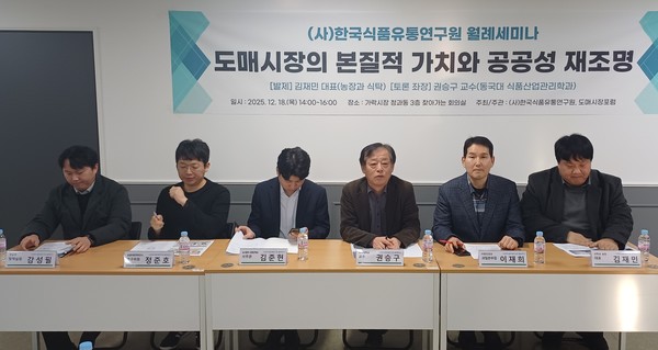 Çѱ¹½ÄǰÀ¯Å뿬±¸¿øÀº Áö³ 18ÀÏ ¼¿ï °¡¶ôµ¿ ³ó¼ö»ê¹°µµ¸Å½ÃÀå ȸÀǽǿ¡¼ ¡®³ó»ê¹° À¯ÅëÀÇ ¿ÀÇØ¿Í Áø½Ç-µµ¸Å½ÃÀåÀÇ º»ÁúÀû °¡Ä¡¿Í °ø°ø¼º ÀçÁ¶¸í¡¯ ¼¼¹Ì³ª¸¦ ¿¾ú´Ù.