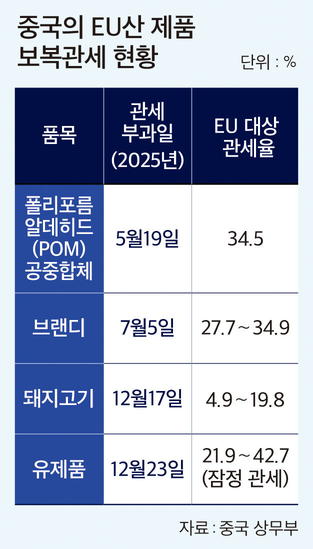 EU»ê À¯Á¦Ç°Àº Áö³ÇغÎÅÍ À̾î¿Â Áß±¹¡¤EU °£ ¹«¿ª °¥µîÀÇ Àü¼± Áß Çϳª´Ù. Áß±¹Àº Áö³ÇØ EU°¡ Áß±¹»ê Àü±âÂ÷¿¡ °íÀ² ¹Ýº¸Á¶±Ý °ü¼¼¸¦ ºÎ°úÇÏÀÚ ÀÌ¿¡ ´ëÇÑ º¸º¹À¸·Î À¯·´»ê ³óÃà»ê¹°, ºê·£µð, ÇÃ¶ó½ºÆ½ ¿ø·á µîÀ» ´ë»óÀ¸·Î ¹Ýº¸Á¶±Ý °ü¼¼¸¦ ÀÕ´Þ¾Æ Á¶Á¤Çß´Ù. ¿Ã 5¿ù Æú¸®Æ÷¸§¾Ëµ¥È÷µå(POM) °øÁßÇÕü¿¡ 34.5%¸¦ ºÎ°úÇÑ µ¥ À̾î 7¿ù EU»ê ºê·£µð¿¡ 27.7¡34.9%, 12¿ù¿£ EU»ê µÅÁö°í±â¿¡ 4.9¡19.8%¸¦ Ã¥Á¤Çß´Ù.