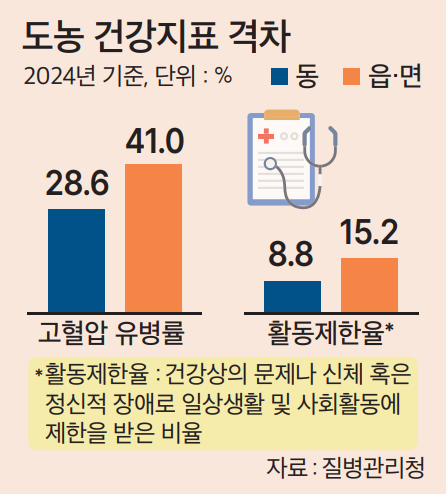 µµ³ó°£ °Ç° ¼öÁØÀÇ Â÷ÀÌ´Â ¶Ñ·ÇÇÏ°Ô ³ªÅ¸³´Ù. Áúº´°ü¸®Ã»ÀÇ ¡®2024 ±¹¹Î°Ç°Åë°è¡¯¿¡ µû¸£¸é ÁÖ°üÀû °Ç° ÀÎÁöÀ²Àº µµ½ÃÁö¿ª(µ¿)ÀÌ 33.8%Áö¸¸, ³óÃÌÁö¿ª(À¾¡¤¸é)Àº 29.1%·Î ³·¾Ò´Ù. °íÇ÷¾Ð À¯º´·üµµ µµ½Ã 28.6%¿¡ ºñÇØ ³óÃÌÀÌ 41.0%·Î Å©°Ô ³ô¾Ò´Ù. °Ç°¹®Á¦³ª ½Åü¡¤Á¤½ÅÀû Àå¾Ö·Î ÀÏ»ó»ýȰÀ̳ª »çȸȰµ¿¿¡ Á¦¾à¹Þ´Â ºñÀ²À» ¶æÇϴ Ȱµ¿Á¦ÇÑÀ² ¿ª½Ã ³óÃÌ(15.2%)ÀÌ µµ½Ã(8.8%)º¸´Ù µÎ¹è °¡±îÀÌ ³ô¾Ò´Ù.