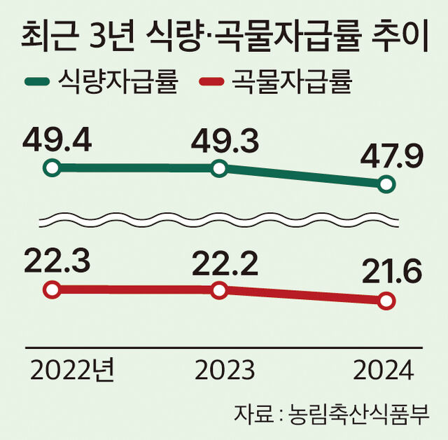 ÃÖ±Ù °ø°³µÈ ¡®2025 ³ó¸²Ãà»ê½Äǰ Åë°è¿¬º¸¡¯¿¡ µû¸£¸é, 2024³â(ÀÌÇÏ ¾ç°î¿¬µµ) ½Ä·®ÀÚ±Þ·üÀÌ 47.9%·Î Áý°èµÆ´Ù. 2023³â 49.3%º¸´Ù 1.4%Æ÷ÀÎÆ® ¶³¾îÁ³´Ù.