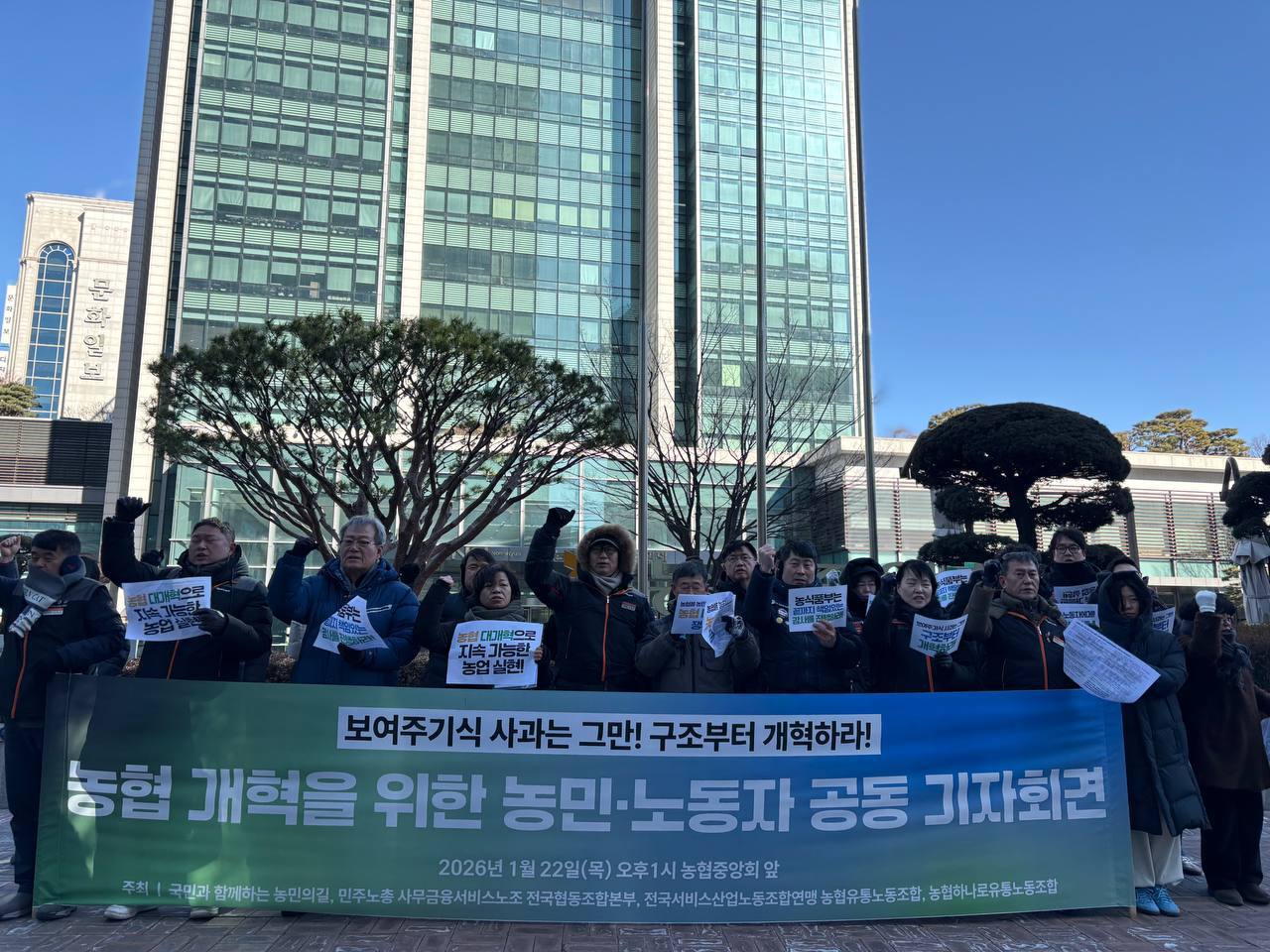 ±¹¹Î°ú ÇÔ²²ÇÏ´Â ³ó¹ÎÀDZæÀº Áö³ 22ÀÏ ¼¿ï ¼´ë¹® ³óÇùÁß¾Óȸ º»°ü ¾Õ¿¡¼ ¡®³óÇù °³ÇõÀ» À§ÇÑ ±âÀÚȸ°ß¡¯À» °³ÃÖÇß´Ù. À̳¯ ȸ°ß¿¡´Â ³ó¹ÎÀÇ±æ ¿Ü¿¡µµ ¹ÎÁÖ³ëÃÑ Àü±¹Çùµ¿Á¶ÇÕº»ºÎ, ³óÇùÀ¯Åë ³ëµ¿Á¶ÇÕ, ³óÇùÇϳª·ÎÀ¯Åë ³ëµ¿Á¶ÇÕ µîÀÌ °øµ¿ÁÖÃÖ·Î ³ª¼ ³óÇùÀ» ÇâÇØ ¾´¼Ò¸®¸¦ ½ñ¾Æ³Â´Ù.