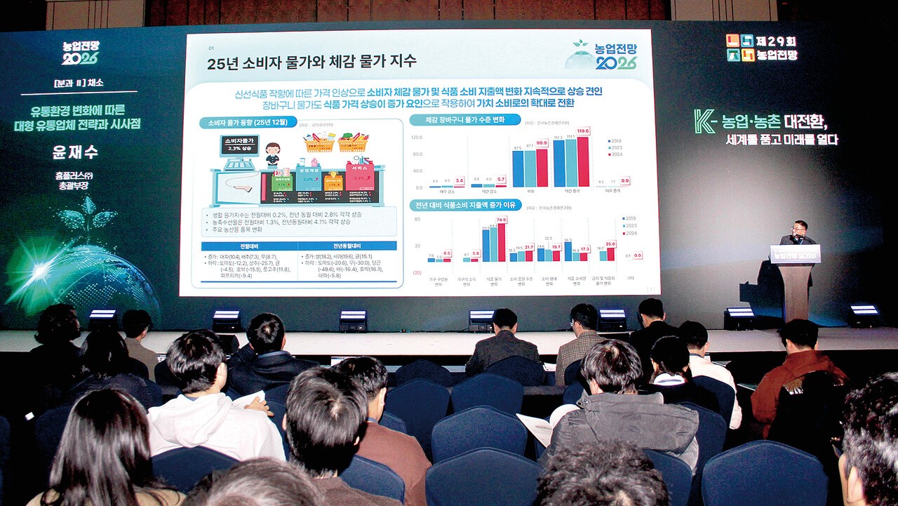 ''³ó¾÷Àü¸Á 2026''¿¡¼ À±Àç¼ö ȨÇ÷¯½º ÃѰýºÎÀåÀº ¡®À¯Åëȯ°æ º¯È¿¡ µû¸¥ ´ëÇü À¯Åë¾÷ü Àü·«°ú ½Ã»çÁ¡¡¯ ¹ßÇ¥¸¦ ÅëÇØ ¼ÒºñÀÚÀÇ Ã¼°¨¹°°¡ ¼öÁØÀÌ ¿Ã¶ó°¨¿¡ µû¶ó ¼Òºñ ÇàÅ¿¡µµ º¯È°¡ ³ªÅ¸³´Ù°í ¹àÇû´Ù. ±×·¯¸é¼ ±âÈĺ¯È°¡ Á¡Â÷ ½ÉÇØÁö¸ç ³ó»ê¹° »ý»êÀÇ ºÒÈ®½Ç¼ºÀÌ Áõ°¡ÇÏ°í ¿øÀÚÀçºñ, ÀΰǺñ, ¹°·ùºñ µî »ý»ê¡¤À¯Åë ºñ¿ë±îÁö Áõ°¡ÇÏ¸ç ¼ÒºñÀÚÀÇ ºÎ´ãµµ Ä¿Áö°í ÀÖÀ½À» ÀüÇß´Ù. ±×´Â ¡°2025³â ³óÃà¼ö»ê¹°ÀÇ ¿¬°£ ¼ÒºñÀÚ¹°°¡Áö¼ö´Â 2.4% »ó½ÂÇß°í, ¼ÒºñÀÚµéÀÇ Ã¼°¨ Àå¹Ù±¸´Ï ¹°°¡µµ Áö¼ÓÇØ¼ ¿Ã¶ó°¡¸ç ½Äǰ ¼Òºñ ÁöÃâ Áõ°¡ÀÇ ¿øÀÎÀ¸·Î ½Äǰ ¹°°¡ º¯È°¡ ²ÅÈ÷°í ÀÖ´Ù¡±°í ¼³¸íÇß´Ù.