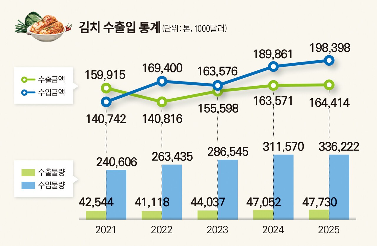 ¹Ý¸é ¼öÃâÀº 2025³â 4¸¸7330ÅæÀ¸·Î Àü³â 4¸¸7053Åæ°ú ºñ±³ÇØ 1.4%°¡ Áõ°¡Çϴµ¥ ±×ÃÆ´Ù. 2025³â ±âÁØ ±èÄ¡ÀÇ ¼öÃâ¾×Àº 1¾ï6441¸¸4000´Þ·¯ÀΠ¹Ý¸é ¼öÀÔ¾×Àº 1¾ï9829¸¸9000´Þ·¯·Î ±èÄ¡ ¹«¿ª¼öÁö°¡ 3398¸¸4000´Þ·¯ÀÇ ÀûÀÚ¿´´Ù. 2021³â ¼öÃâ 1¾ï5991¸¸5000´Þ·¯, ¼öÀÔ 1¾ï4074¸¸2000´Þ·¯·Î 1917¸¸3000´Þ·¯ ÈæÀÚ¸¦ ±â·ÏÇÑ ÀÌÈÄ ¸Å³â ÀûÀÚ´Ù.