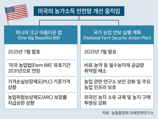ÀÏ·Ê·Î Áö³ÇØ 7¿ù ¹ßÈ¿µÈ ¡®ÇϳªÀÇ Å©°í ¾Æ¸§´Ù¿î ¹ý(One Big Beautiful Bill)¡¯Àº ³ó¾÷¹ý À¯È¿±â°£À» 2031³â±îÁö ¿¬ÀåÇÏ¸é¼ ³ó¾÷ º¸Á¶±Ý Áö±Þü°è¿Í À§Çè°ü¸® ½Ã½ºÅÛÀ» ´ëÆø °³ÆíÇß´Ù. ƯÈ÷ ³ó»ê¹° °¡°ÝÀÌ ±âÁذ¡°Ý ÀÌÇÏ·Î Ç϶ôÇÏ¸é ¼Õ½ÇÀ» º¸ÀåÇÏ´Â ¡®°¡°Ý¼Õ½Çº¸ÀåÁ¦µµ(PLC)¡¯ÀÇ ±âÁذ¡°ÝÀ» »óÇâÇϰí, ³ó°¡ ¼öÀÔ °¨¼Ò¸¦ º¸ÀüÇÏ´Â ¡®³ó¾÷À§Ç躸»óÁ¦µµ(ARC)¡¯ÀÇ º¸Àå·ü°ú Áö±Þ »óÇѼ±À» ¿Ã·È´Ù.