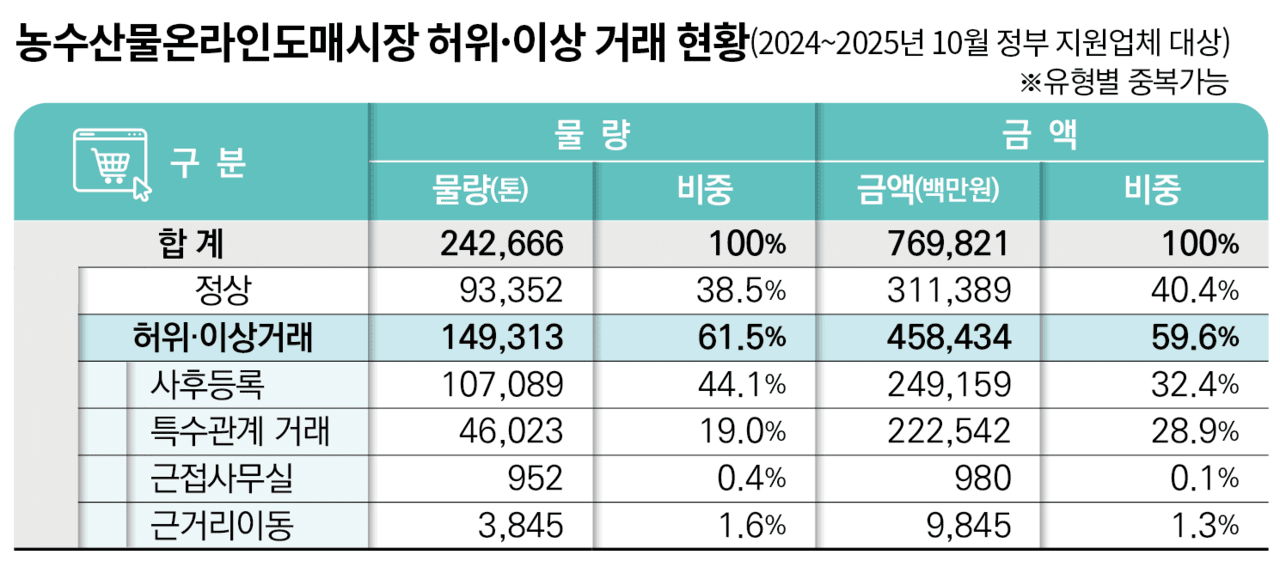 ±¹°¨ ÀÌÈÄ ³ó¸²Ãà»ê½ÄǰºÎ°¡ ½Ç½ÃÇÑ ¡®Á¤Ã¥Áö¿øÀ» ¹ÞÀº ¾÷üº° ³ó¼ö»ê¹° ¿Â¶óÀεµ¸Å½ÃÀå °Å·¡ ½ÇÅ Àü¼öÁ¶»ç(2024³â~2025³â 10¿ù)¡¯ °á°ú¿¡ µû¸£¸é, Á¶»ç ´ë»ó °Å·¡ ÃѾנ7698¾ï¿ø °¡¿îµ¥ 4584¾ï¿øÀ̠Ư¼ö°ü°èÀΠ°Å·¡, ¹è¼ÛÁö ÀÎÁ¢ °Å·¡, ¿î¼ÛÁ¤º¸ ¹ÌÀԷ µî ÇãÀ§¡¤ÀÌ»ó°Å·¡·Î ºÐ·ùµÆ´Ù. À̴ °Å·¡¾× ±âÁØ 59.6%, ¹°·® ±âÁØÀ¸·Î´Â 61.5%¿¡ ÇØ´çÇÑ´Ù.